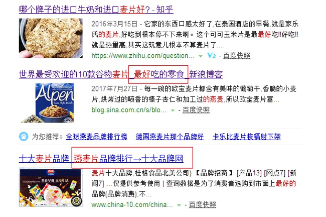 這里所說的標題與關(guān)鍵詞的匹配,不是單純意義上指標題的關(guān)鍵詞與內(nèi)容的關(guān)鍵詞一樣,這里要講的是同義詞與意圖匹配:當我在百度搜索,最好的麥片,搜索結(jié)果如下: