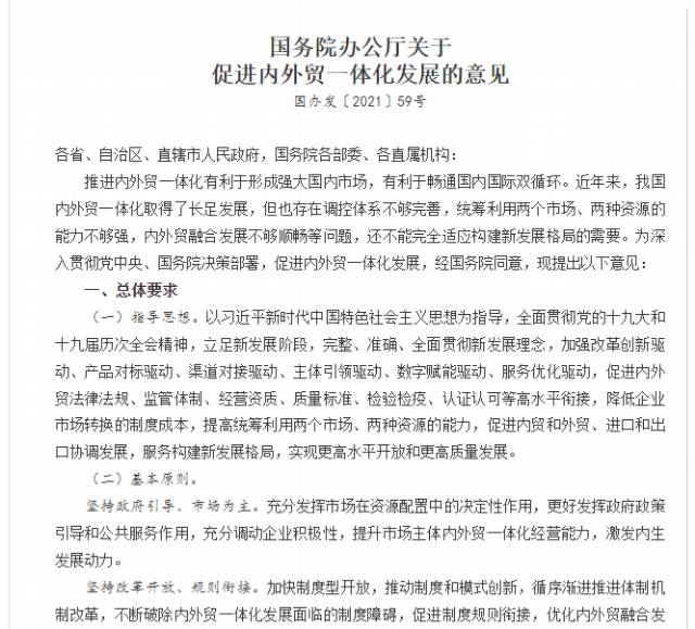 今年初,國務(wù)院辦公廳印發(fā)了《關(guān)于促進(jìn)內(nèi)外貿(mào)一體化發(fā)展的意見》(以下簡稱《意見》),就促進(jìn)內(nèi)外貿(mào)一體化,形成強大國內(nèi)市場,暢通國內(nèi)國際雙循環(huán)做出部署。《意見》提出,到2025年,市場主體內(nèi)外貿(mào)一體化發(fā)展水平進(jìn)一步提升,內(nèi)外聯(lián)通網(wǎng)絡(luò)更加完善,政府管理服務(wù)持續(xù)優(yōu)化,內(nèi)外貿(mào)一體化調(diào)控體系更加健全,實現(xiàn)內(nèi)外貿(mào)高效運行、融合發(fā)展。