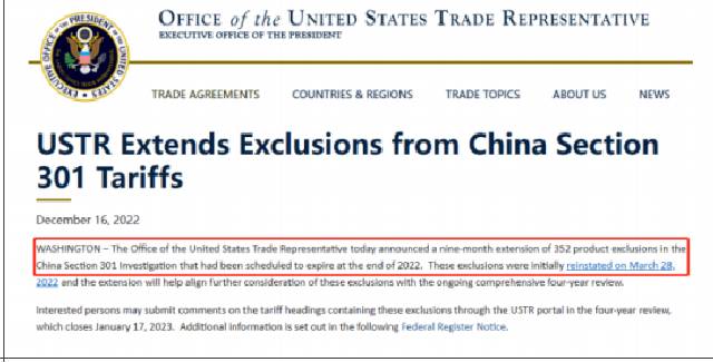 近日,美國(guó)貿(mào)易代表辦公室(USTR)發(fā)布聲明,宣布將原定于2022年底(12月31日)到期的適用于352項(xiàng)中國(guó)產(chǎn)品的關(guān)稅豁免期限延長(zhǎng)九個(gè)月,至2023年9月30日,將于2023年1月1日起生效。