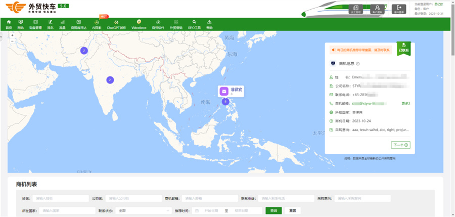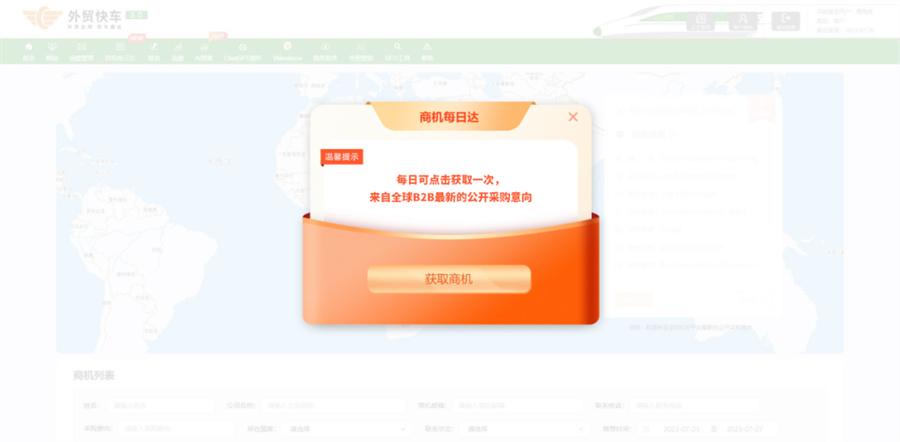 今年以來,各地更是先后印發(fā)了一系列措施和方案,扎實(shí)推進(jìn)內(nèi)外貿(mào)一體化工作。在此背景下,作為獨(dú)立站領(lǐng)域的排頭兵,外貿(mào)快車積極響應(yīng),于2023年10月27日宣布,將運(yùn)用新技術(shù)為中國外貿(mào)企業(yè)搜羅更精準(zhǔn)的海外商機(jī),正式上線外貿(mào)主動營銷王牌功能——商機(jī)每日達(dá)。