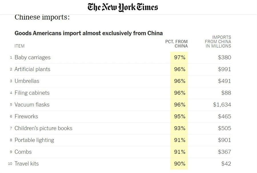 據(jù)了解,《紐約時(shí)報(bào)》發(fā)表的一篇文章以梳理清單的方式,展現(xiàn)了普通美國人生活中的“中國制造”,以及關(guān)稅可能對他們生活產(chǎn)生的影響。